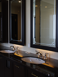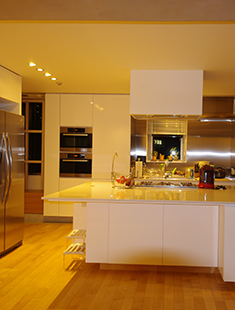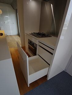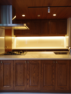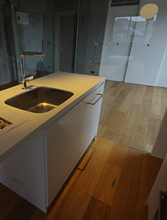 大理石と扉材をキッチンと同一材にしてイメージを統一しています。